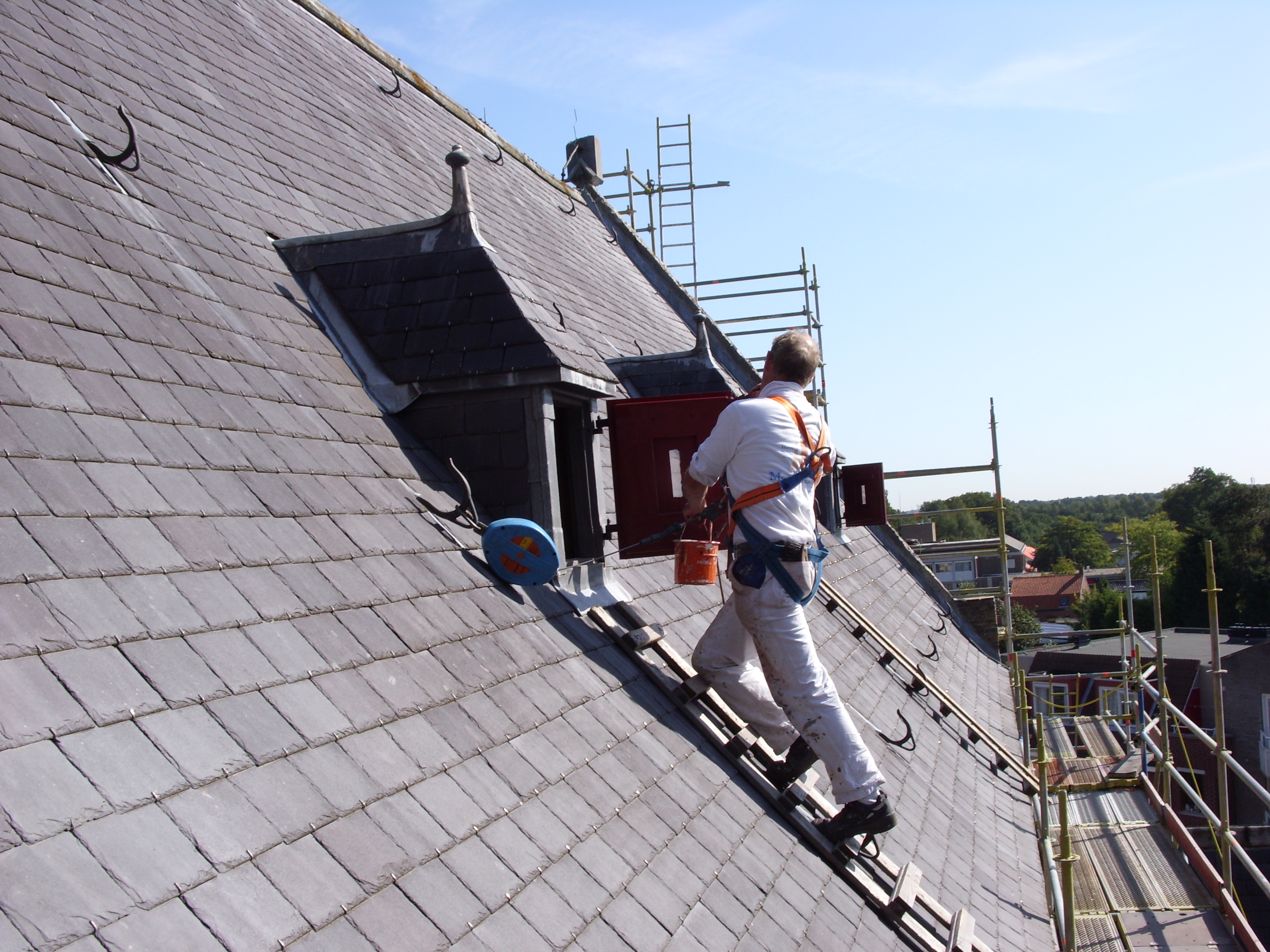 achtergevel na restauratie | gehele voorgevel na restauratie | detail voorgevel | plafond en muur hal tijdens restauratie | plafond en wand na schilderen |  |